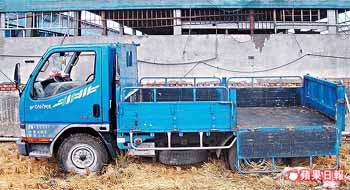 偷豬車動彈不得,竊賊將車斗柵欄放下棄車逃離。 來源:臺灣《蘋果日報》