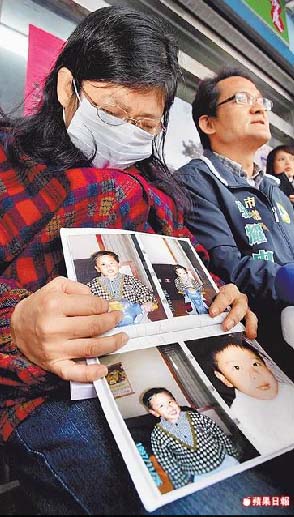 沈姓男童疑因施打甲流流感疫苗猝死,他的母親昨天手持兒子照片出席記者會,難忍悲痛數(shù)度哭泣。 來源:臺灣《蘋果日報》