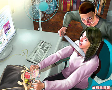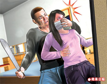 陳映彤在家上網時,被歹徒姜文淵以長刀抵住脖子,喝令她拿出錢,她從皮包里拿出港幣和信用卡給姜文淵。 來源:臺灣《蘋果日報》