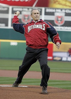 近期的臺灣《自由時報》體育版,放了一張布什幫華盛頓國民隊開球的照片,乍看之下沒什么特別,但仔細看球衣上的字竟是“NATIONAL DISGRACE”,NATIONAL代表著國家,DISGRACE可是代表著恥辱。其實2005年布什幫華盛頓國民隊開幕戰開球的畫面,胸前只有NATIONALS的字樣,因為真正的球衣就印著這幾個字。