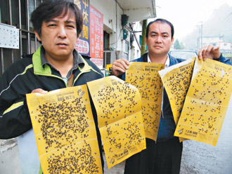 新竹縣尖石鄉(xiāng)新樂(lè)村水田部落最近陷入“蒼蠅危機(jī)”,圖為粘滿蒼蠅的黏蠅板。圖片來(lái)源:臺(tái)灣《聯(lián)合報(bào)》