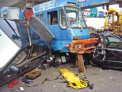 臺中縣清水鎮(zhèn)16日傍晚發(fā)生嚴(yán)重車禍,20噸吊車疑因剎車失靈,連續(xù)追撞12部車,現(xiàn)場多部汽車被撞得如疊羅漢,造成2死6傷慘劇。 來源:臺灣《中國時報》
