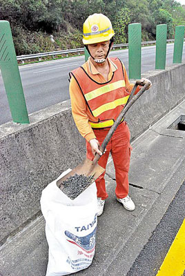 臺(tái)灣高速公路警方緊急出動(dòng)清潔人員清除螺絲釘。 圖片來源:臺(tái)灣《中國時(shí)報(bào)》