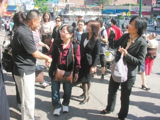 陳樹菊(左二)在紐約法拉盛街頭遇到熱情民眾跟她握手。
