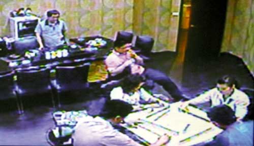 臺中角頭翁奇楠命案槍擊現(xiàn)場泡茶室曝光,臺中市警方昨晚公布錄像畫面,圖為事發(fā)五日前,臺中市警偵查佐戴志宏(右下角、著藍(lán)衣)正與另三人打麻將。