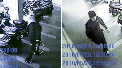 臺中市警方昨晚公布翁奇楠遭槍擊案相關(guān)錄像畫面,圖為兇手持槍(左圖圈處)走過槍擊現(xiàn)場附近民宅騎樓的畫面。 圖片來源:臺灣《聯(lián)合報》