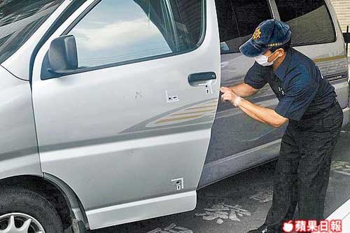 臺南永康警分局偵查隊偵防車被歹徒劫走,警方開槍圍捕,子彈貫穿偵防車車門。圖片來源:臺灣《蘋果日報》
