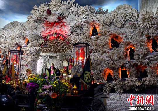進入7月中下旬的臺灣富福頂山寺游客大增。這座寺廟位于三芝鄉(xiāng)橫山山上,據(jù)說是一位信徒從1996年起用上百種珊瑚與六萬多種貝殼堆砌而成,故又稱貝殼廟。此廟主奉祀濟公活佛和十八羅漢與圣母娘娘。廟堂建筑特別,色彩斑斕,猶如“海底世界”,慕名而來的香客游人絡(luò)繹不絕,香火旺盛。中新社發(fā) 宋吉河 攝