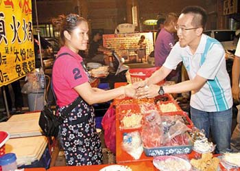 身陷召妓疑云的陳致中(右),25日晚間前往高雄夜市拜票。圖片來源:臺(tái)灣《中國(guó)時(shí)報(bào)》