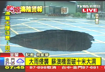 中國(guó)臺(tái)灣網(wǎng)10月22日消息 據(jù)臺(tái)灣TVBS電視臺(tái)報(bào)道,臺(tái)灣宜蘭蘇澳降雨量累積達(dá)939毫米,刷新去年8月8日“莫拉克”臺(tái)風(fēng)在臺(tái)東大武創(chuàng)造的808.5毫米的最高紀(jì)錄。昨(21)日,蘇澳一座涌泉橋因?yàn)榈鼗槐┯晏钥眨瑯蛎嫔掀屏艘粋(gè)10米寬的大洞。