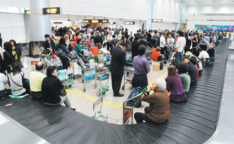 桃園機場昨天傍晚突然停電,第二航廈行李處理系統(tǒng)停擺,上千名旅客在入境行李轉(zhuǎn)盤處等候。圖片來源:臺灣《聯(lián)合報》