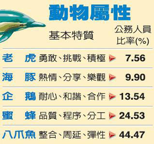 職能評鑒系統(tǒng)以老虎、海豚、企鵝、蜜蜂、八爪魚等五種動物屬性,代表五種公務員的人格特質。圖片來源:臺灣《聯(lián)合報》