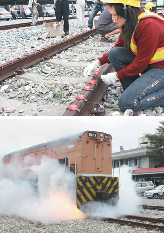 花蓮運務段昨天銷毀全臺最后一批響燉,員工將468個預備報廢的響燉,一個個裝在鐵軌上(上圖),當列車壓過響燉時,產生巨大聲響與濃煙(下圖)。圖片來源:臺灣《聯合報》