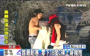據(jù)臺灣TVBS報道,這2天臺灣天氣冷,但有情侶偏偏就愛酷寒的氣候,在極地挑戰(zhàn)擁抱最久的比賽。