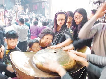 云林北港武德宮財神爺廟涌進(jìn)大批人潮,大家爭相撫摸鎮(zhèn)殿大元寶,希望財運(yùn)亨通。 來源:臺灣《中國時報》
