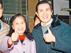 臺灣宜蘭市拾荒婦人楊黃牡丹(左)上月?lián)斓?10萬元,交付失主后堅拒酬金,讓馬英九相當感動,昨日親赴楊家拜訪,贊揚她是“臺灣之光”。圖片來源:臺灣《中國時報》