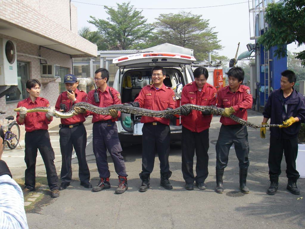 據(jù)報道,高雄市消防局今天中午接到報案指出,高雄市某高速公路截流站的排風(fēng)管上方突然出現(xiàn)不速之客——一條超級大蟒蛇。因蟒蛇十分巨大,先到現(xiàn)場的兩名消防隊員不敢輕舉妄動,于是通報勤務(wù)中心,后來連同6名支援隊員合力將蟒蛇擒獲。