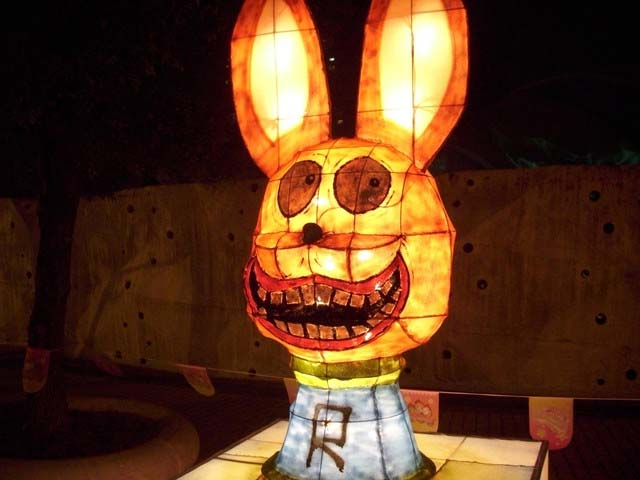 據(jù)報(bào)道,網(wǎng)友robbie2010受朋友之邀參觀燈會(huì),當(dāng)他經(jīng)過(guò)入口附近的彩繪花燈區(qū)時(shí),卻被這組可怕的兔子燈籠嚇到:只見(jiàn)這只“殭尸兔”張著血盆大口,露出臟兮兮的牙齒,還有不懷好意的笑容;最令人感到不安之處,就是它的眼睛呈現(xiàn)詭異的“上吊狀”,好像正在打量來(lái)往的游客們。