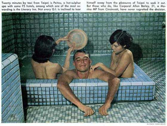 中國臺灣網3月2日消息 據臺灣“今日新聞網”報道,一張歷史照片也許可以牽扯出一段復雜的歷史。1967年12月22日,美國《時代雜志》刊登了一篇敘述駐越南美軍有5天海外“特別假”的報道。文中特別提到讓美軍放假時間“消遣”的幾個都市,其中便包括臺北。在介紹臺北時,《時代雜志》刊登了一張北投區(臺北市最北方,聞名遐邇的是北投溫泉)女服務生陪浴的照片。這張照片使得臺北久久無法擺脫“買春之城”的印象,蔣介石看到報道后也勃然震怒。