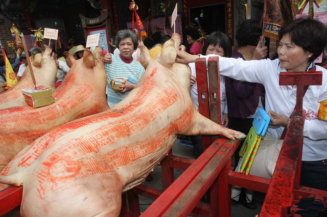 祝壽大典結束后,民眾爭相拔取祭典臺兩側的豬公毛,認為有添福、保平安功效。圖片來源:臺灣媒體