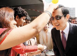 馬英九在出席有關活動中,參觀國際學生園游會攤位時,一位印度學生熱情的在馬英九額頭抹上吉祥印記,也讓馬英九十分開心。 聯合報圖