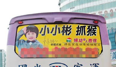 據(jù)臺(tái)灣《聯(lián)合報(bào)》報(bào)道,臺(tái)灣知名童星小小彬替征信業(yè)者代言,寫著“小小彬抓猴”(“抓猴”意為抓外遇)的廣告牌,放在客運(yùn)車上在臺(tái)灣“趴趴走”,臺(tái)中市議員抨擊“兒童抓猴”是負(fù)面教育,市長(zhǎng)胡志強(qiáng)認(rèn)為很不妥,且違反“兒少法”,下令今天起“不撤廣告就開罰”。