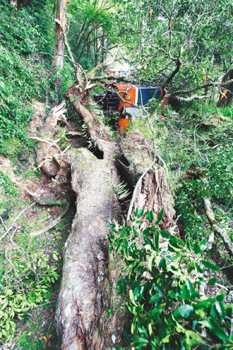 阿里山小火車翻覆意外,經(jīng)現(xiàn)場勘查懷疑森氏櫟是白蟻與真菌蛀食枝干,導致枝干斷裂擊中小火車。圖片來源:臺灣《聯(lián)合報》