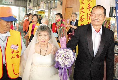 楊林平還多次大喊“太太萬歲、我愛你”。阿公非常開心,不時笑開懷,阿嬤穿著細肩婚紗畫著淡妝,依偎在阿公的身旁,不時顯露出嬌羞表情,兩人以目傳情,無聲勝有聲的眼眸,羨煞在旁觀禮的民眾。