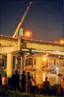 潛水人員約在晚間7點30分,找到沉入河底的深藍色轎車,發現車子前后擋風玻璃、兩側車窗全都破碎,后方車牌還在,車里沒有人,放在車上的皮包則浮出水面。