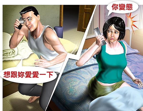 撥錯電話調情示意圖:陳姓男子睡前打電話給女友,按錯號碼撥給蔡姓女子,還說出:“想跟你愛愛一下”,蔡姓女子氣憤大罵:“你變態!”并報警。圖片來源:臺灣媒體