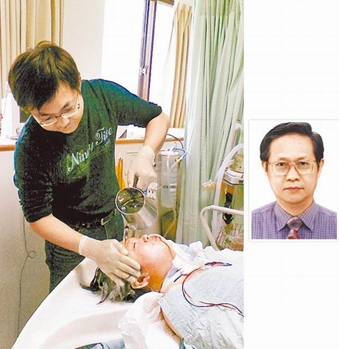 醫(yī)師徐章虎(小圖)插管不當(dāng)導(dǎo)致廖惠麗變成植物人,其夫李永信每天幫妻子洗頭。圖片來源:臺灣媒體