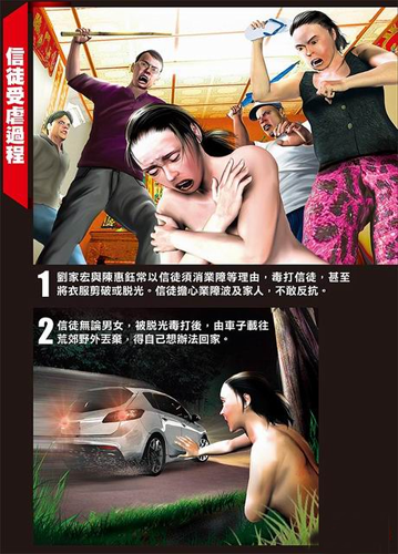 劉姓被害人說,他與妻子被脫得一絲不掛,由4、5名會員拿藤條、雨傘等物,在神像面前毒打,嘴里還得配合說:“我是自愿受罰的!”心里卻是又羞又痛。