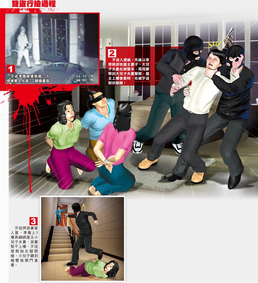 之后,持槍歹徒押著游妻上3樓,準(zhǔn)備再捆綁游的小兒子夫妻,游妻擔(dān)心小兒子受傷害堅(jiān)不登樓,歹徒以為她拖延時(shí)間,竟朝她右腳開(kāi)了一槍。報(bào)道稱(chēng),睡3樓的小兒子夫妻聽(tīng)到槍聲出房查看時(shí),歹徒要游妻先回2樓房間,隨即用槍對(duì)著小兒子夫妻說(shuō):“快把錢(qián)拿出來(lái)!”順手扯下他脖子上上價(jià)值新臺(tái)幣6萬(wàn)元、約1兩重的金項(xiàng)鏈。