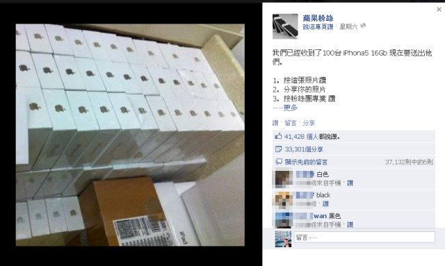 粉絲團大方送百臺iPhone5惹議(圖片來自臺灣“今日新聞網”)