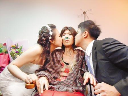 31歲的林梓堯和妻子洪瑋琳眼眶泛淚跪在母親面前完成終身大事。(圖片來自臺灣《中國時報》)