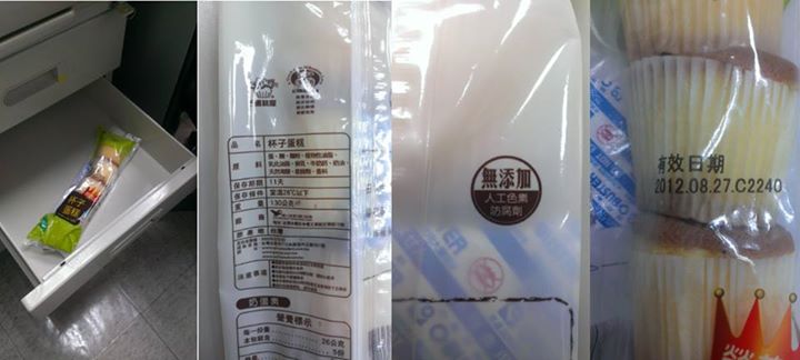 洪浩云表示,某天他在值班室休息的時候很無聊,于是翻翻柜子找找抽屜,想找點東西看看,然后在抽屜里發(fā)現了杯子蛋糕。剛好肚子餓了,正想吃的時候,瞄到了它的保存期限:2012.08.27,過期了快一年。“我當下整個人精神來了,仔細看著這包未拆封的蛋糕,有趣!”
