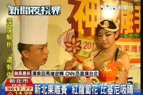 據(jù)臺灣TVBS網(wǎng)站報道,臺灣新北市第二屆果雕競賽,本周六、日即將登場,120組選手角逐總額40萬元(新臺幣,下同)的獎金,19日比賽前哨站,特地邀請國際果雕師傅大展刀工,除了5分鐘用水果打造兔子,小鴨等造型,還用紅蘿卜、芋頭雕出比基尼和頭冠,讓現(xiàn)場模特兒穿在身上。