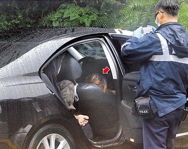 五分埔徐姓富商(后座者)疑走不出喪妻之痛,偕新婚妻(箭頭處)于車上燒炭雙亡。(臺(tái)媒圖)