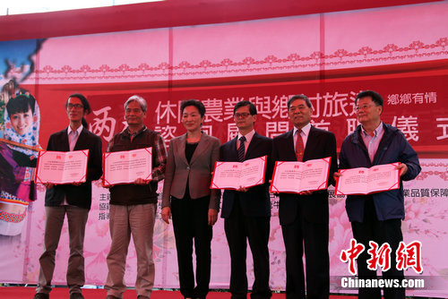 4月1日,“兩岸鄉(xiāng)村休閑旅游嘉年華”在臺灣苗栗縣飛牛牧場開幕。 活動(dòng)由福建省旅游協(xié)會(huì)、臺灣鄉(xiāng)村旅游協(xié)會(huì)、臺灣休閑農(nóng)業(yè)發(fā)展協(xié)會(huì)、臺灣旅行業(yè)品質(zhì)保障協(xié)會(huì)聯(lián)合主辦。圖為福建方面聘任臺灣休閑農(nóng)業(yè)發(fā)展協(xié)會(huì)顧問邱涌忠、臺灣休閑農(nóng)業(yè)學(xué)會(huì)創(chuàng)會(huì)理事長陳昭郎、臺灣鄉(xiāng)村協(xié)會(huì)理事長鄭健雄等人為兩岸休閑農(nóng)業(yè)與鄉(xiāng)村旅游咨詢顧問,希望專家學(xué)者能夠?yàn)楦=ㄠl(xiāng)村旅游發(fā)展獻(xiàn)計(jì)獻(xiàn)策。(左3)為福建省旅游協(xié)會(huì)會(huì)長朱華。