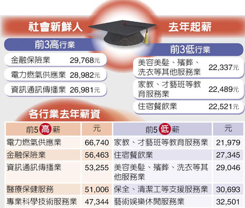 若以行業(yè)別來看,最有行情的社會(huì)新鮮人,首推金融保險(xiǎn)業(yè),平均起薪29768元,電力及燃?xì)夤⿷?yīng)業(yè)居次,28982元,服務(wù)業(yè)的起薪相對(duì)則較低,僅22K、23K。