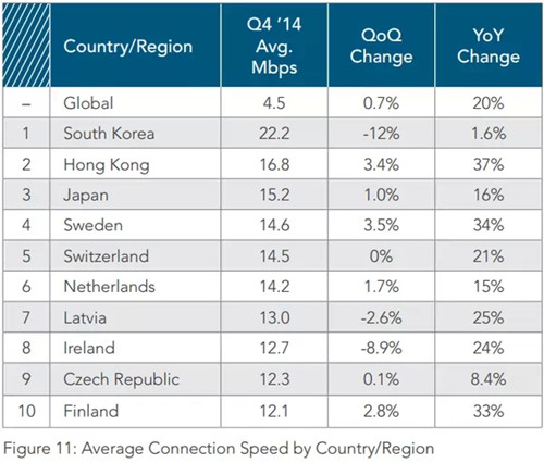 網速全球第二。根據全球CDN服務提供商Akamai發布的《2014年第四季互聯網發展狀況報告》顯示,香港網速僅次于韓國位居全球第二,平均網速為16.8Mbps,是世界平均值4.5Mbps的大約3.5倍。