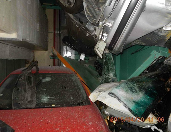 臺北市松江路128號停車塔因為地震影響,汽車掉落,多輛汽車堆棧。臺灣聯合新聞網圖