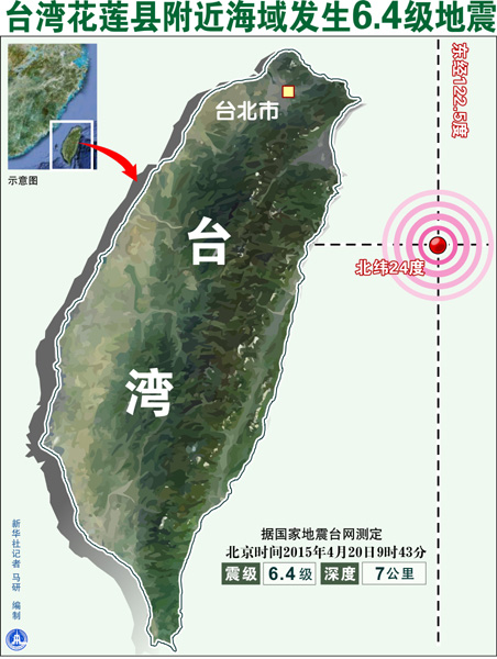 圖表:臺灣花蓮縣附近海域發生6.4級地震。(新華社記者 馬研 編制)
