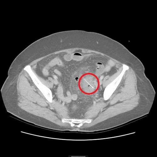 沒想到過了2天,老奶奶又來看診,醫師便為她安排住院檢查,經計算機斷層檢查,發現老奶奶乙狀結腸部份竟然有根2.5公分的魚刺,且魚刺已經穿破腸道,導致橫膈膜下方有氣體出現,經外科醫師協助開刀,終于順利幫老奶奶解決腹部不適的問題。