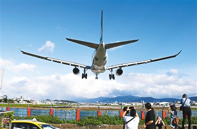 圖為部分游客和市民在臺北松山機場附近觀看飛機降落。新華社記者 朱 祥攝
