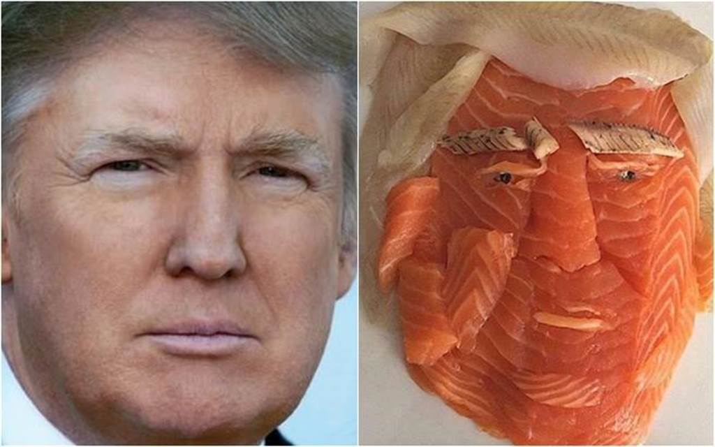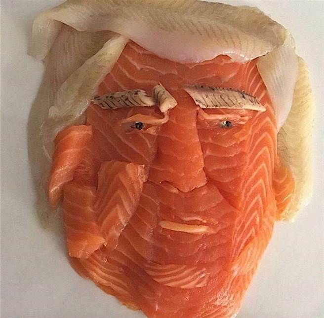 網(wǎng)友用生魚(yú)片拼出的“特朗普”相片,從發(fā)型、五官神情一直到臉部輪廓、肌理紋路全都維妙維肖。(臉書(shū)“爆廢公社”截圖)