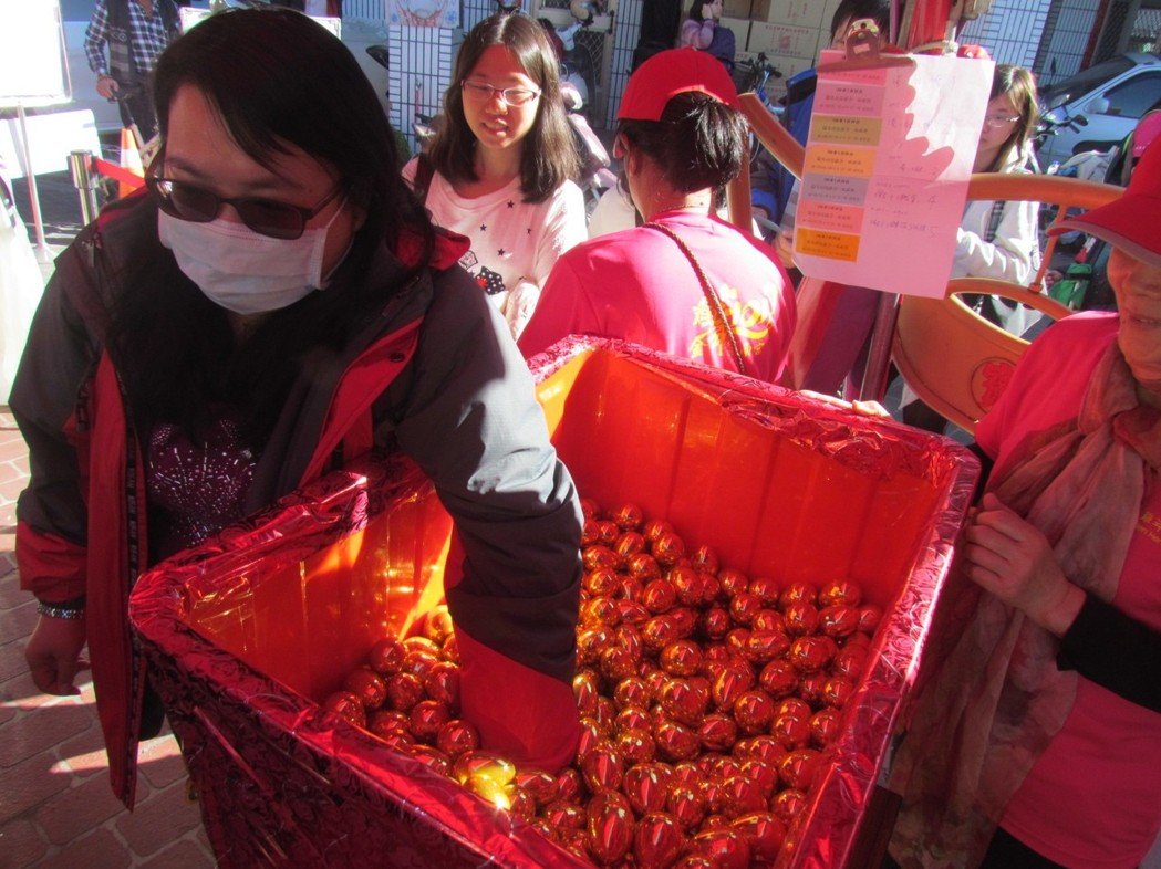 紫南宮大年初一發(fā)“錢母”,信眾興奮地抽金雞蛋。(圖片來(lái)源:臺(tái)灣《聯(lián)合報(bào)》)