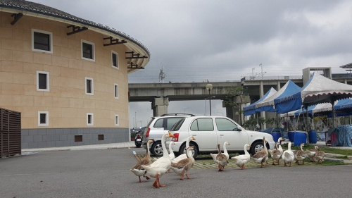 苗栗縣知名景點“客家圓樓”周邊水域放養的華鵝、綠頭鴨等水禽,最近頻頻上岸“逛大街”。臺灣《聯合報》記者胡蓬生/攝影
