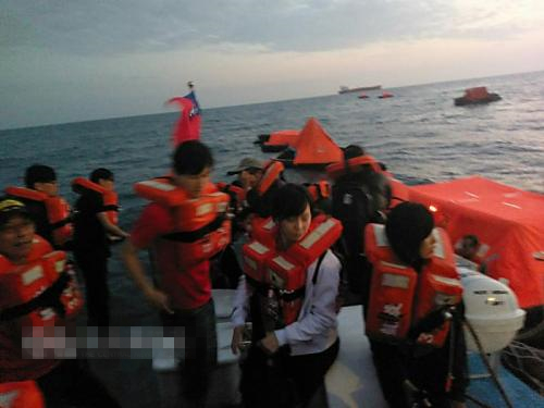 圖為海巡隊將乘坐救生艇的游客救上巡防艇。圖片來源:臺灣“中央社”