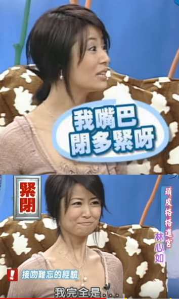 據臺灣“東森新聞云”報道,林心如2004年曾在訪談節目《康熙來了》談及最難忘的接吻經驗,當時小S問及有沒有拍過伸舌頭的吻戲,她急忙表示拍吻戲沒有人伸舌頭的。但是小S隨后追問“爾康也沒有”,她露出夸張表情并直呼“我嘴巴閉得多緊啊”,隨后她還堅稱自己不僅緊咬牙關還緊閉雙唇,坦承對方真的有試圖伸進來。可她也有幫忙解釋,稱可能對方是太投入在演戲當中,“也不是故意想頂的”。